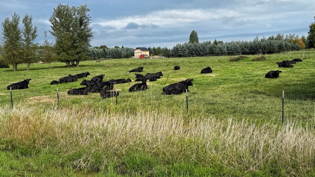 Time to continue on and loop back to our car. And stop along the way for roadside attractions. —— and cows ;’-)