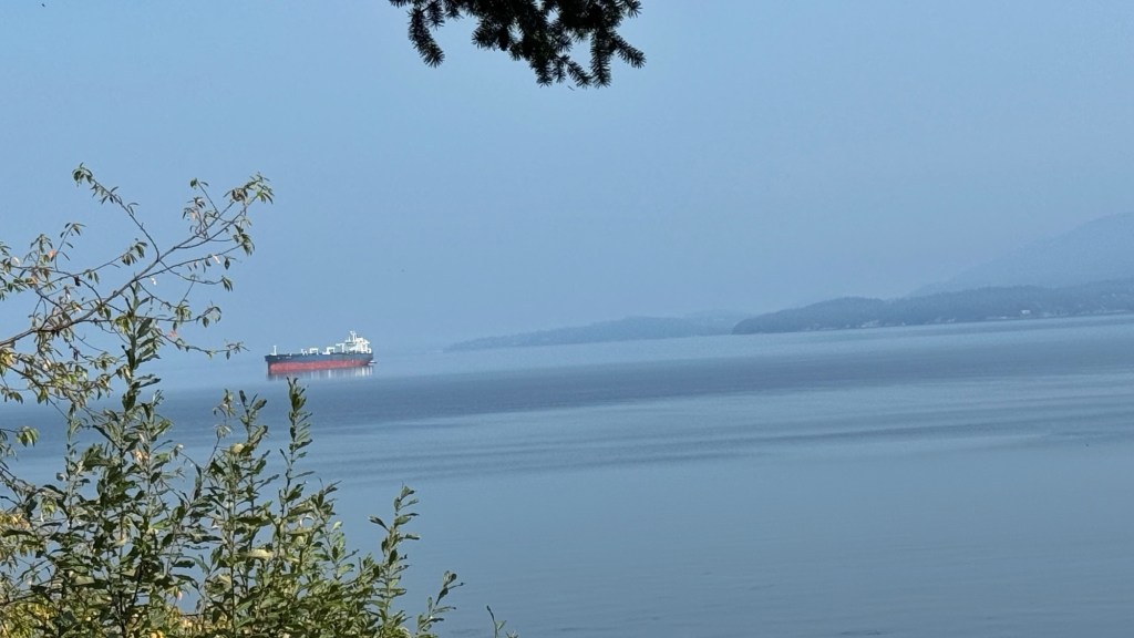 At the overview spot, with picnic table and porta pottie, we look out across Samish Bay and see the smoke from Canada fires that hampers a clear sunny day. Fortunately the air quality was ok enough for our ride.