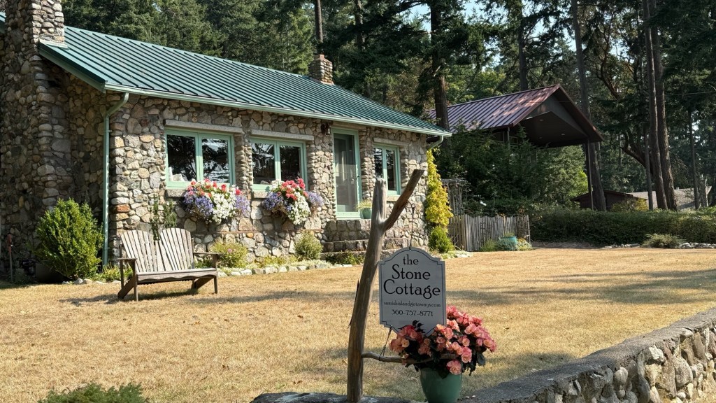 On the last leg of the island and as we round the corner, I can almost never resist this stone cottage that overlooks Padilla Bay. Seems idyllic.