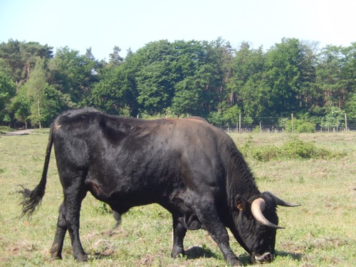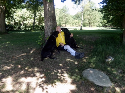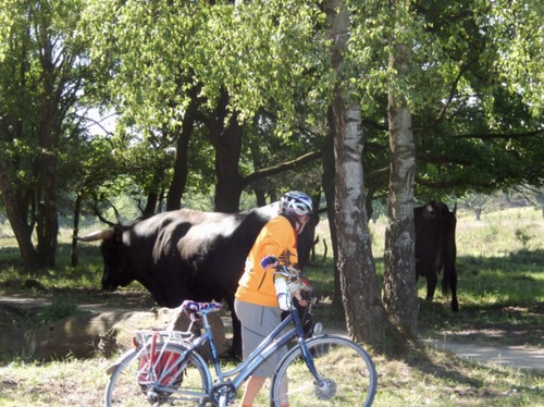 Today we cycled through thick-treed forests on unpaved but very hard packed trail. My regret is that in such a group ride, I could not stop to take any photos of our route through the forests on our way to the Hoge Veluwe Park. But I did get a photo of Doug being loved by the dogs at our coffee & snack stop. He says it was his peanut butter sandwich.