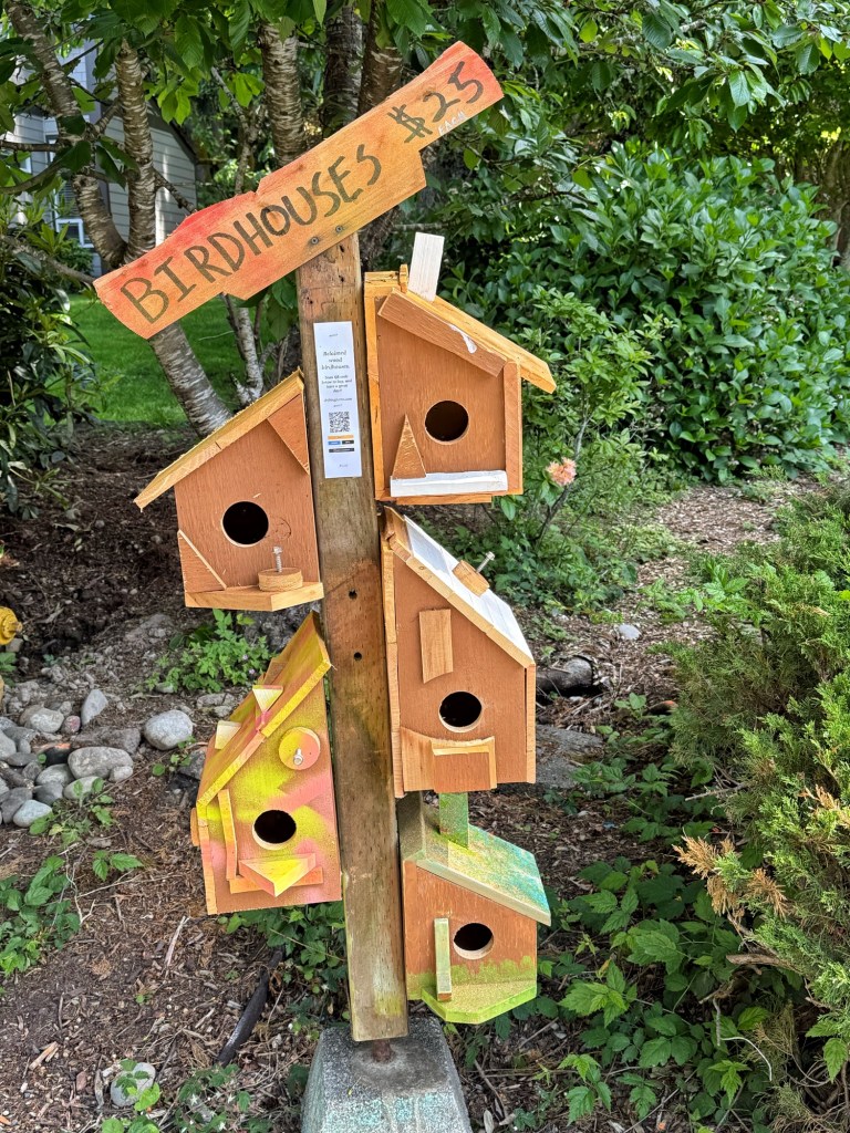 These birdhouses look like they may have been built by a youngster. Just a feeling I get by the somewhat lackadaisical trim and the screws, plus their positioning, for a perch.