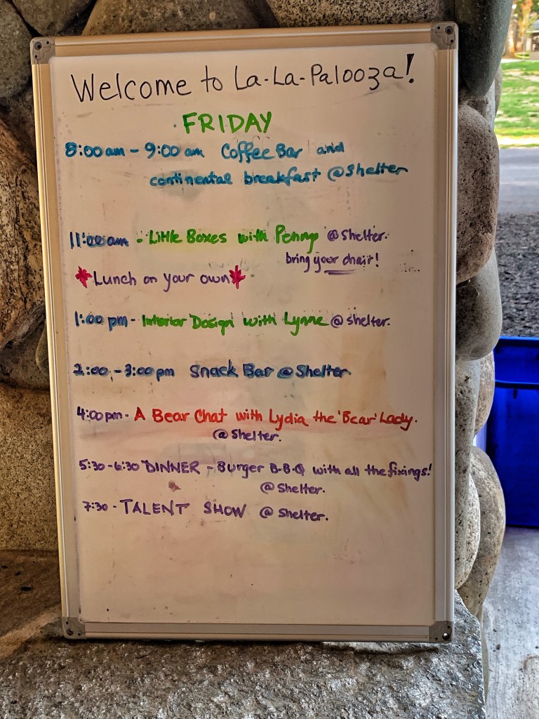 Our next full day at camp started with the usual breakfast gathering and the list of activity for the day. Read down the list and see the “talent show”.