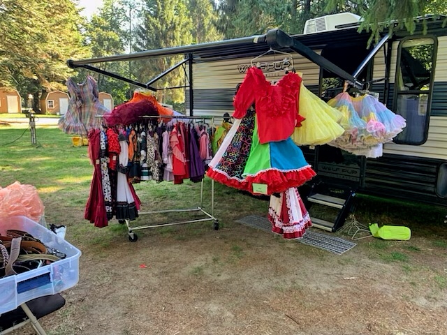 Strolling around the campground I see that the ‘crinoline lady’ has arrived for those wishing for one.