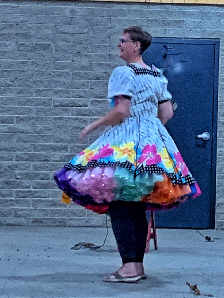 Time for the evening’s entertainment to begin!. Nadine, in her newly purchased crinoline and dress, performed as our exuberant emcee.