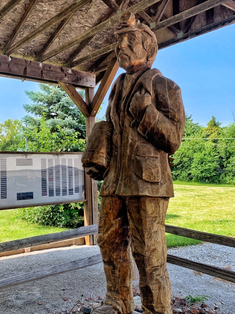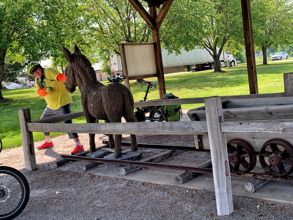 We got to Slater and simply meandered around town which had nothing interesting enough to take a photo of. Both Madrid and Slater are towns that RAGBRAI will be traveling through and there are lines of outhouses along the Main Street to help accommodate them. This was our turn around point, the half way mark of our trip. We stopped for water refill at the Madrid Rest area and Susan posed as a corn kernel – or maybe as a tassel.
