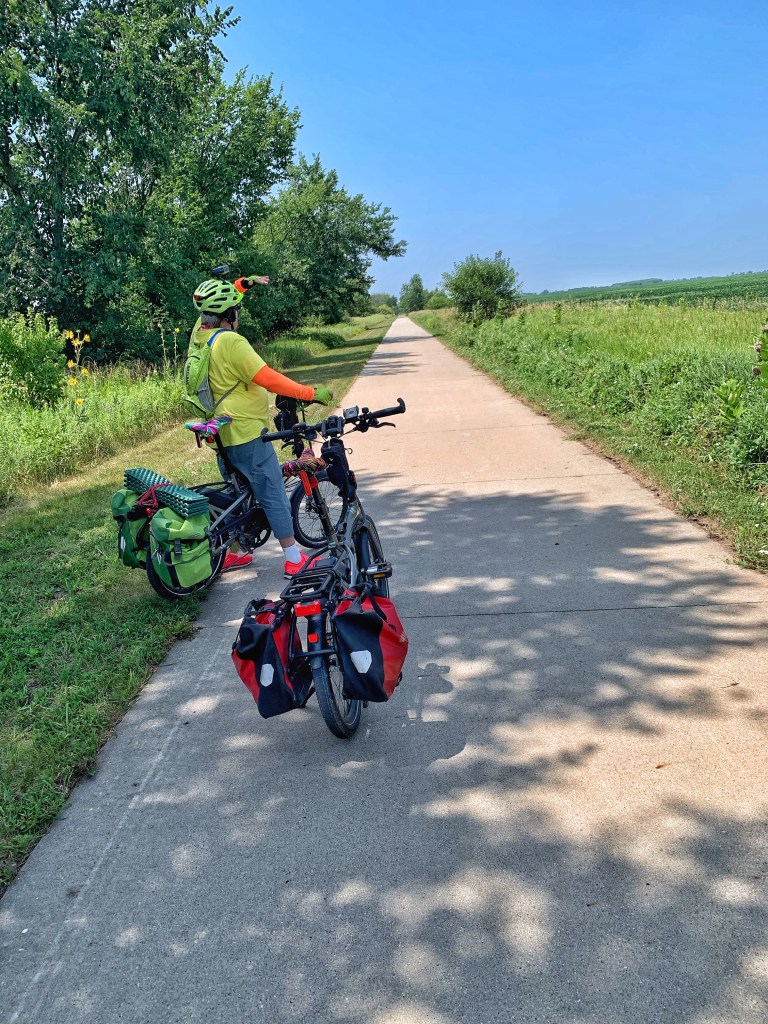 Not only is the trail pancake flat, which means you never stop pedaling, but also it is arrow straight. There are no swooping turns that curve around to a bucolic view, there are no up and downs that encourage coasting for at least a short time. Just flat and straight and mostly in open sun with only a few overhanging trees for a minute of respite. Here Susan looks out to see if there is anything but flat, but as far as the eye can see it is ALL flat just like the rest of the Iowa we have seen.