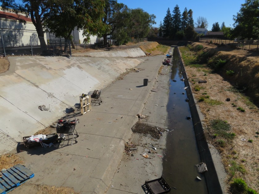 No water in the canal, but detritus instead.