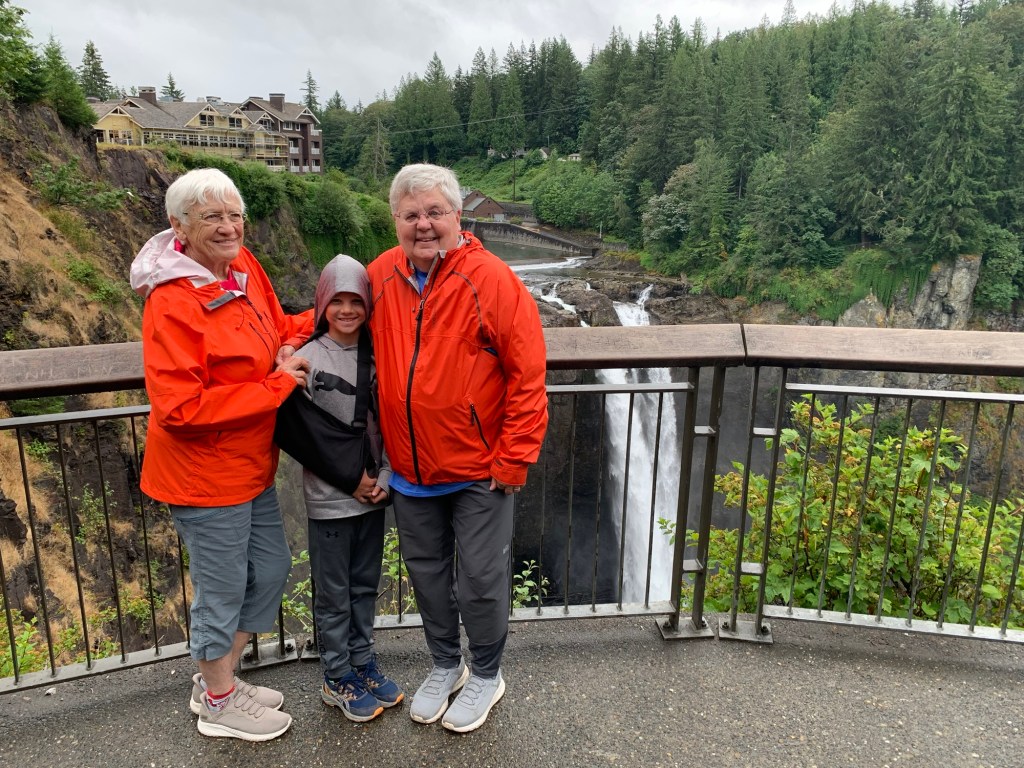 They did have a good camp but E fell early in the ride and had enough soreness in his arm and shoulder, he had to miss the first two days of camp! So we did some sightseeing with him which included a drive to Snoqualmie Falls.
